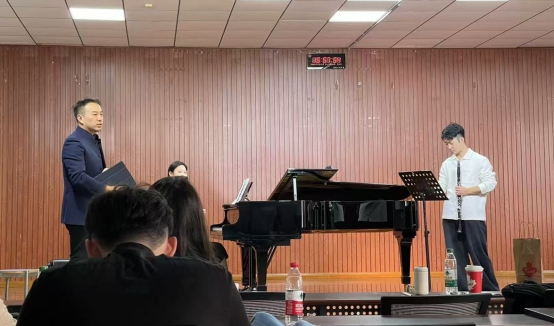 在武漢音樂(lè)學(xué)院的學(xué)術(shù)交流活動(dòng)中,張放副教授為鋼琴系和管弦系的十組研究生室內(nèi)樂(lè)重奏組合進(jìn)行了授課,講解了包括《貝多芬第三大提琴奏鳴曲》、《弗蘭克A大調(diào)小提琴奏鳴曲》、《賴內(nèi)克<水仙女>長(zhǎng)笛與鋼琴奏鳴曲》、《勃拉姆斯第二單簧管奏鳴曲》、《程大兆<陜北四章>竹笛與鋼琴》、《劉莊——鋼琴與大提琴浪漫曲》、《皮亞佐拉鋼琴三重奏——四季》、《海頓鋼琴三重奏》等經(jīng)典中外作品。他的授課內(nèi)容深入淺出,分享了豐富的舞臺(tái)實(shí)踐經(jīng)驗(yàn),并以輕松幽默的氛圍進(jìn)行教學(xué)。