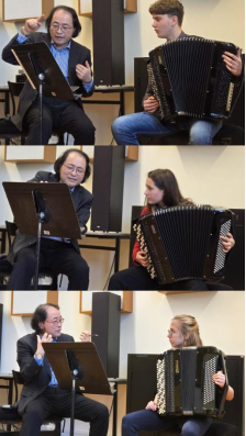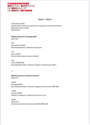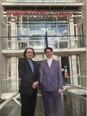 比賽期間,曹曉青教授還受法國巴黎國立高等音樂舞蹈學院手風琴教授Vincent Lhermet先生邀請在該校舉辦了大師班活動。此次大師班活動面向來自世界各地的學生,為他們提供了一次難得的學習機會。曹曉青教授采用全英文授課,他以其細致耐心地傳授手風琴演奏技巧與音樂理解,引導學生深入挖掘作品內涵,幫助學生提升演奏水平和藝術視野,并且與學生們進行了良好的互動。在大師班活動中,曹曉青教授不僅傳授了知識和技能,更促進了不同文化背景的學生之間的交流與合作,推動了手風琴專業的國際化發展。