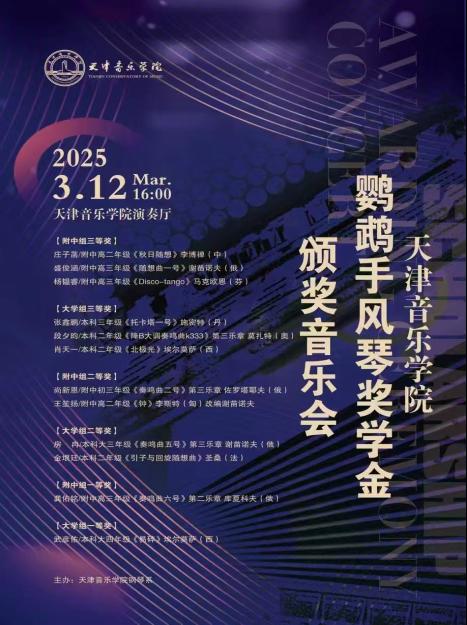 在頒獎典禮上天津鸚鵡有限公司副總經理張輝與鋼琴系系主任孟輝教授共同為獲獎學生頒獎,并在頒獎典禮后舉行了獲獎選手音樂會。