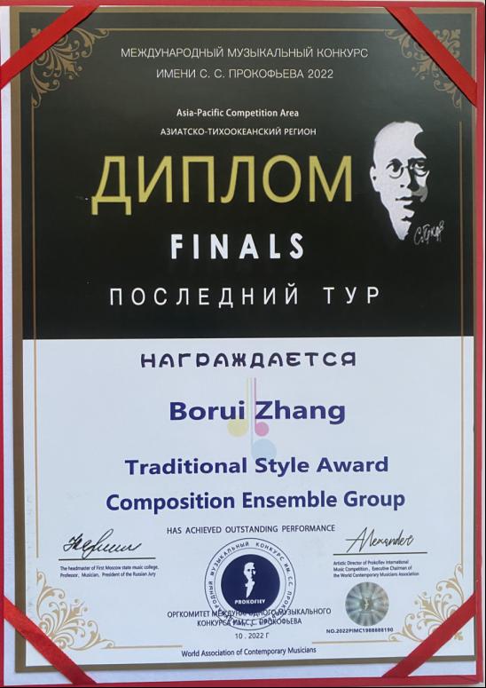普羅科菲耶夫國際音樂比賽是1991年俄羅斯聯邦文化部為了紀念作曲家普羅科菲耶夫誕辰100周年設立的一項重要的國際音樂賽事。迄今為止,該賽事已得到全球60多所高等藝術院校的認可與支持。2022普羅科菲耶夫國際音樂比賽(亞太賽區決賽)作曲項目于2022年11月19日-11月28日以線上比賽形式進行了作曲獨奏作品組和作曲合奏作品組的競爭。