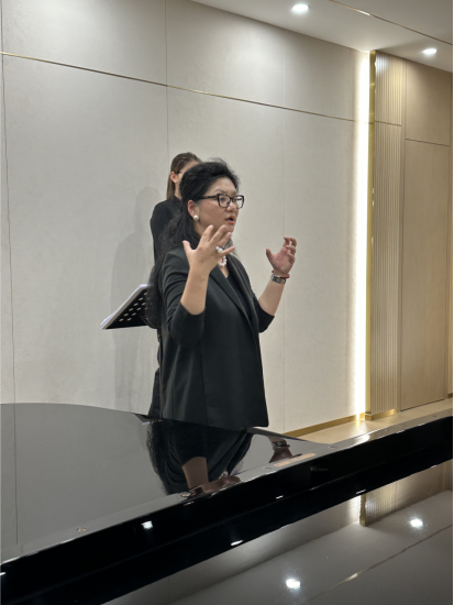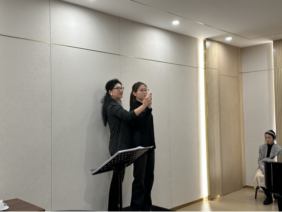 陳冰教授的專家課通過學(xué)生們準(zhǔn)備的不同作品展開,沿著學(xué)生的指揮技術(shù)、作品背景、指揮需要的形象展開深入教學(xué),并在不同年級的學(xué)生中提出不同的要求和需要達到的能力。她指出,指揮應(yīng)該從全方位包裝自己,用自己的技術(shù)智慧、語言表達能力等方面讓樂隊能快速領(lǐng)悟需求并讓樂隊信服。陳冰教授還指出,對于指揮專業(yè)的同學(xué),一是要加強對樂器演奏法的了解,對于弓法,弓速,吹奏都要有所要求;二是要加強對總譜研究深入,通過站在樂隊的視角來分析總譜,想象音樂觸感并用指揮法表達出來;三是要提高音樂審美和音樂追求。