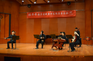 音樂會的最后一首曲目是由任丹丹老師創作的、為板胡、笙、揚琴、大阮和打擊樂而作的《絲弦序》。樂曲取材河北石家莊絲弦戲,是京津冀地區特有的古老劇種之一,板胡作為唱腔的伴奏樂器,在絲弦戲中占有重要地位。此曲主要樂器也為板胡,同時在重奏的聲部中運用了西方的和聲與復調等傳統技法,將中西音樂以各自的“傳統”相結合,而產生了一種和諧又熱烈的氣氛。