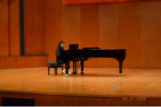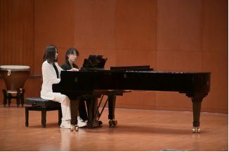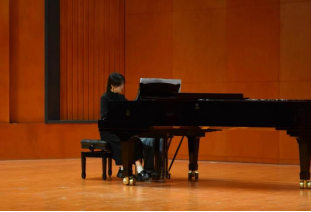 2020級本科生鄧喧妍的四手聯彈《Rain Sound (雨聲)》,以音樂渲染雨聲氛圍,和聲大量使用了不同性質的七和弦的連續進行,具有泛調性的色彩,整體音樂具有一種清冷的氣質。