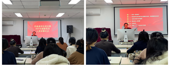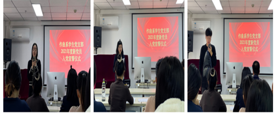 本站訊(編輯 徐莉莉 攝影 徐莉莉 高依波 責任編輯 劉文平 )今年是中國共產黨成立100周年,在這個特殊的年份,作曲系學生黨支部迎來了4名新黨員。為繼承和發(fā)揚黨的光榮傳統(tǒng)和優(yōu)良作風,進一步鞏固黨史學習教育成果,增強基層黨組織的戰(zhàn)斗力、凝聚力和吸引力,強化黨員意識,作曲系學生黨支部于12月8日召開“牢記入黨誓詞,堅定理想信念”主題黨日活動暨2021年度新黨員入黨宣誓儀式。宣誓儀式由作曲系專職組織員徐莉莉主持。