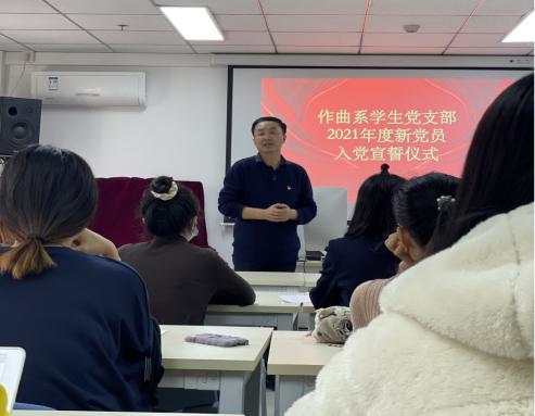 最后,作曲系黨總支書記兼主任劉文平代表系黨總支向新黨員表示歡迎和祝賀,并對新老黨員提出了殷切希望,勉勵大家作為學生黨員要踐行入黨誓詞,堅定理想信念,認真學習政治理論,提高政治素養(yǎng),提升專業(yè)能力,關心集體,在困難和險境面前迎難而上,挺身而出,成為一名讓周圍同學能夠交口稱贊的真正的共產黨員。