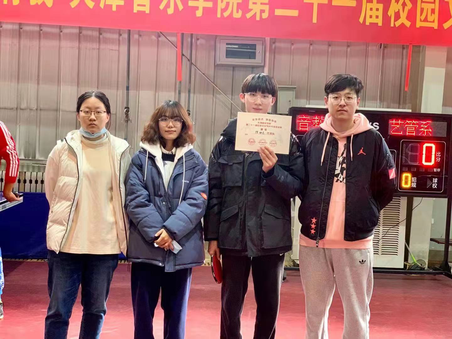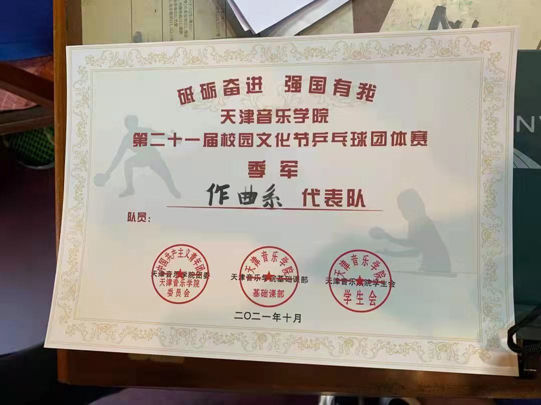 本站訊(編輯 王子梁 姜美伊 責任編輯 劉文平 攝影 姜美伊 )秋楓霜葉迎風舞,紅柿枝頭笑臉揚。2021年10月26日,我院舉辦第二十一屆校園文化節乒乓球團體賽。王子梁、??梢狻⒗铎`菲、繆蔚四名同學代表作曲系參加了此次比賽,并最終榮獲季軍。