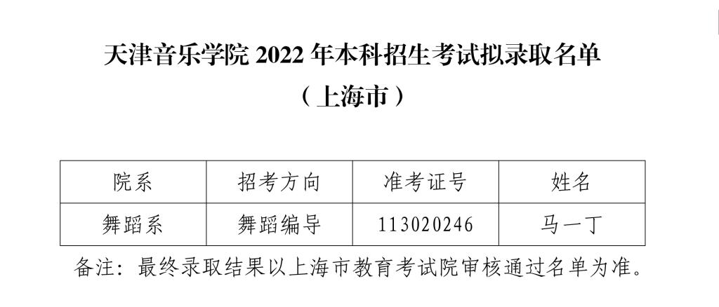 天津音樂學院2022年本科招生考試擬錄取名單(上海市)