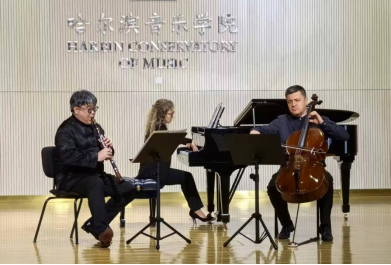 在藝術節交流音樂會上,解川教授帶來了兩場精彩的合作演出。首先,他與俄羅斯鋼琴家維羅妮卡、大提琴家弗拉基米爾攜手,共同演繹了《貝多芬三重奏作品11號》第二樂章。三位藝術家憑借精湛的技藝與默契的配合,將貝多芬作品中兼具抒情性與戲劇性的特點展現得淋漓盡致。隨后,解川教授又與哈爾濱音樂學院青年教師王宇、江幸澤合作,演奏了朱塞佩·里柯達的《單簧管雙胞胎》,該作品以靈動的節奏、俏皮的旋律著稱,三人通過精準的節奏把控與生動的音樂表達,完美詮釋了作品的獨特風格。