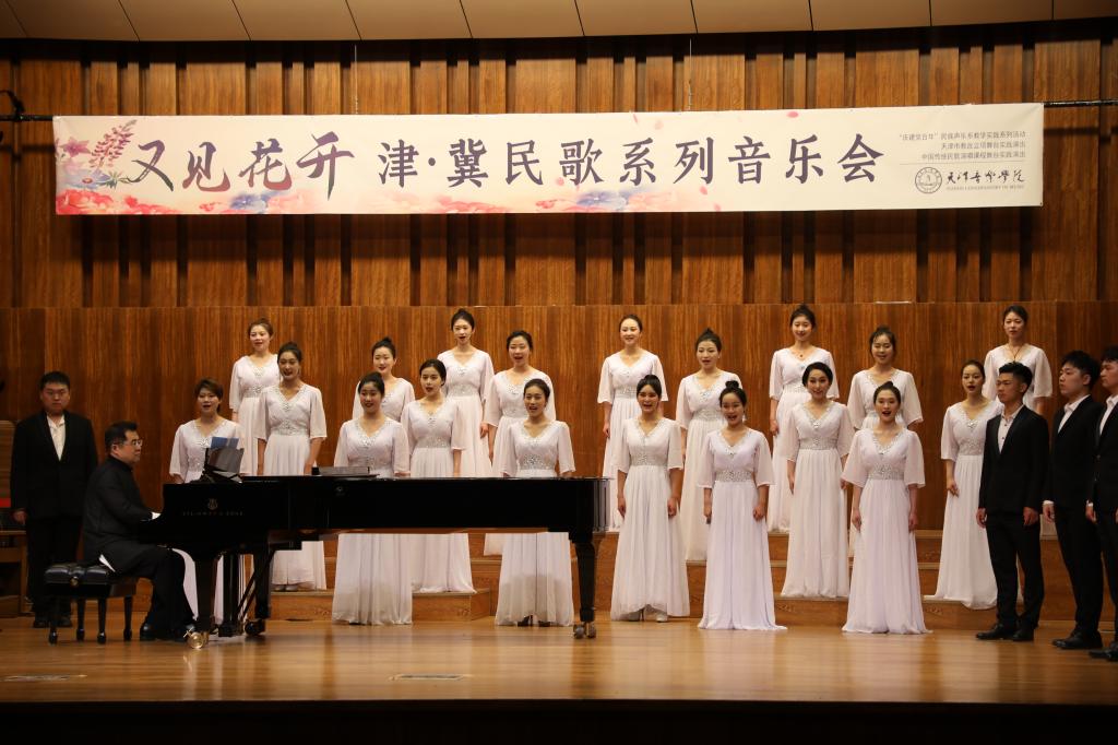 音樂會以女生合唱河北民歌《鬧元宵》開場。由梁美惠、葉駿逸同學分別演唱了河北民歌《放風箏》和《虹彩妹妹》。女高音重唱天津民歌《畫扇面》將我們帶回了那個街頭巷尾人人哼唱的老天津衛。之后由楊昊龍、劉迎宵、苗宸瑞、項君君同學演唱了河北民歌《小白菜》、天津民歌《媽媽娘你好糊涂》、張北民歌《走西口》,同學們各具特色的聲腔與語調,把民歌中飽含的感情表現得淋漓盡致。同學們以男生合唱和女生合唱的形式,分別演繹了河北民歌《小放牛》、張家口民歌《散花》、晉縣民歌《反對花》、冀東民歌《撿棉花》和《小看戲》。同學們清澈明亮的歌聲,為我們展現了河北各地域民歌獨具特色的方言、唱腔和語調,讓觀眾們清晰地感受到了津冀民歌的風格特點。音樂會的最后,全體學生演唱了天津民歌《蓮花落》和河北民歌《十朵花》。