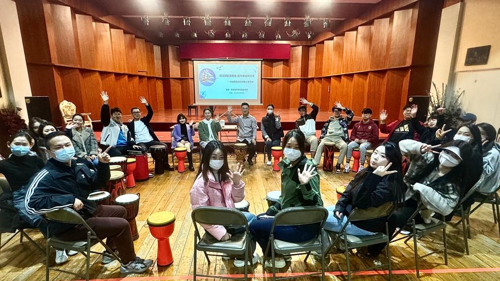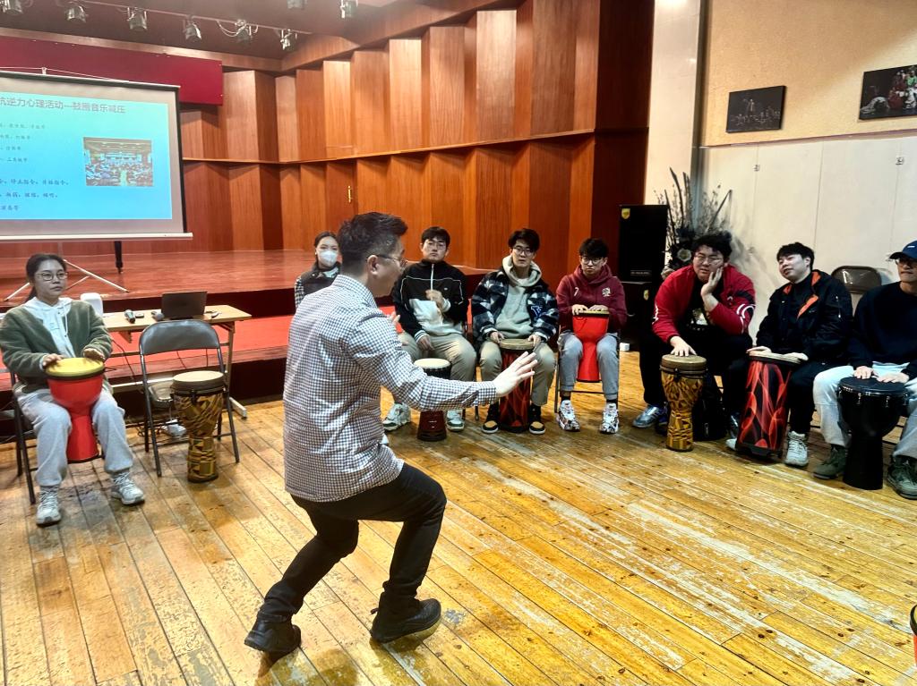 本次培訓結合音樂心理學、音樂治療理論方法,通過鼓圈解壓、身體打擊樂等技法,以音樂節奏作為媒介將同學們連接在一起。活動中,大家敲擊樂器,宣泄情緒、釋放壓力、表達內心感受、增進團隊建設。通過體驗式活動,使同學調節情緒、放松身心,學會在就業擇業期,如遇到壓力將如何進行自我調適,同學們在參與體驗的趣味活動中舒緩壓力、建立信心。
