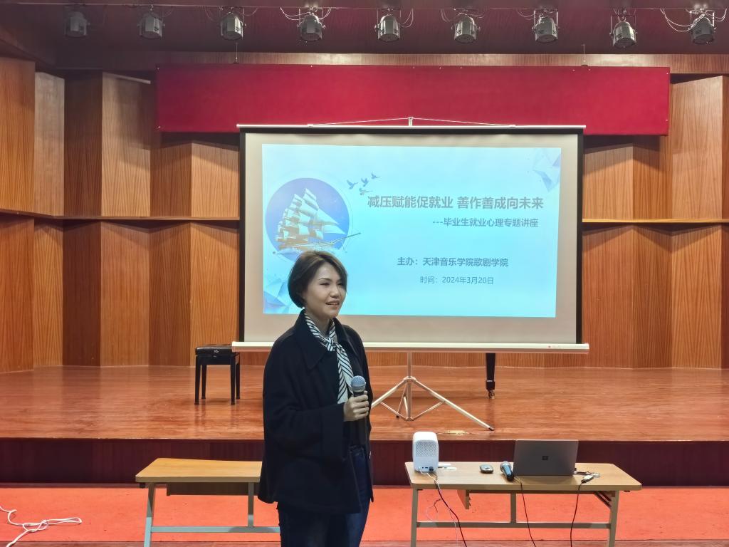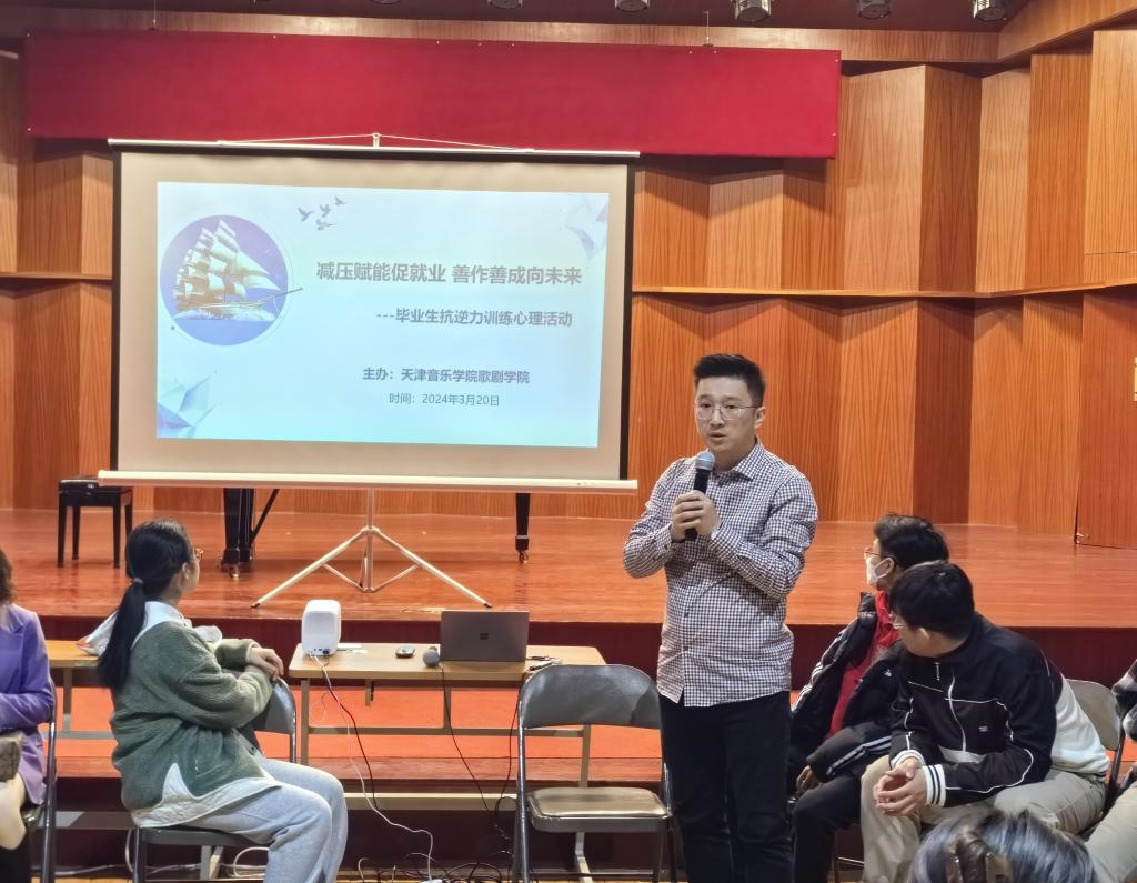 為認真落實市教育兩委和我校黨委學工部關于加強學生心理健康教育工作的部署,3月20日,天津音樂學院歌劇學院在北院歌劇中心舉辦 “減壓賦能促就業 善作善成向未來”畢業生就業心理專題講座及抗逆力訓練團體活動。會議由歌劇學院輔導員,大學生思政教研室教師田野、趙曉詩老師主持。