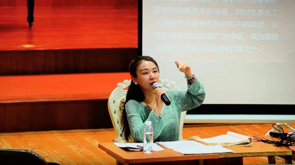 孫瑜老師發(fā)揮黨員教師自身專業(yè)特長(zhǎng),選取從《黃河大合唱》到《義勇軍進(jìn)行曲》等抗日戰(zhàn)爭(zhēng)時(shí)期的經(jīng)典作品,運(yùn)用演唱與講解相結(jié)合的形式,引領(lǐng)學(xué)生重溫紅色經(jīng)典,發(fā)揚(yáng)紅色精神,傳承紅色基因,培育社會(huì)主義核心價(jià)值觀。讓學(xué)生們深刻體會(huì)到作品意境與內(nèi)涵的同時(shí),學(xué)會(huì)用音樂(lè)講黨史,用藝術(shù)講黨史。