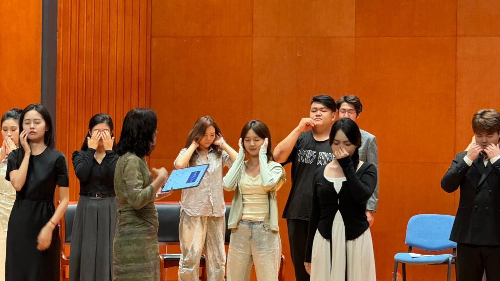唐梋梋老師重點講到,歌劇演員最重要的是感知身體。身體感知影響舞臺表演。歌劇中不僅有歌唱,還有大量的表演成分。演員需要通過身體語言來傳達角色的情感、性格和故事。敏銳的身體感知能讓演員準確地控制肢體動作的幅度、力度和節奏,使表演更加自然流暢、富有感染力。例如,一個細微的手勢、一個恰到好處的轉身,都可能為角色增色不少。再者,身體感知有助于應對演出壓力。歌劇演出往往時間長、強度大,對演員的體力和耐力是很大的考驗。感知身體的狀態可以讓演員及時調整自己的能量分配,避免過度疲勞和受傷。在緊張的演出環境中,演員通過放松身體、調整呼吸等方式,可以緩解壓力,保持良好的表演狀態。