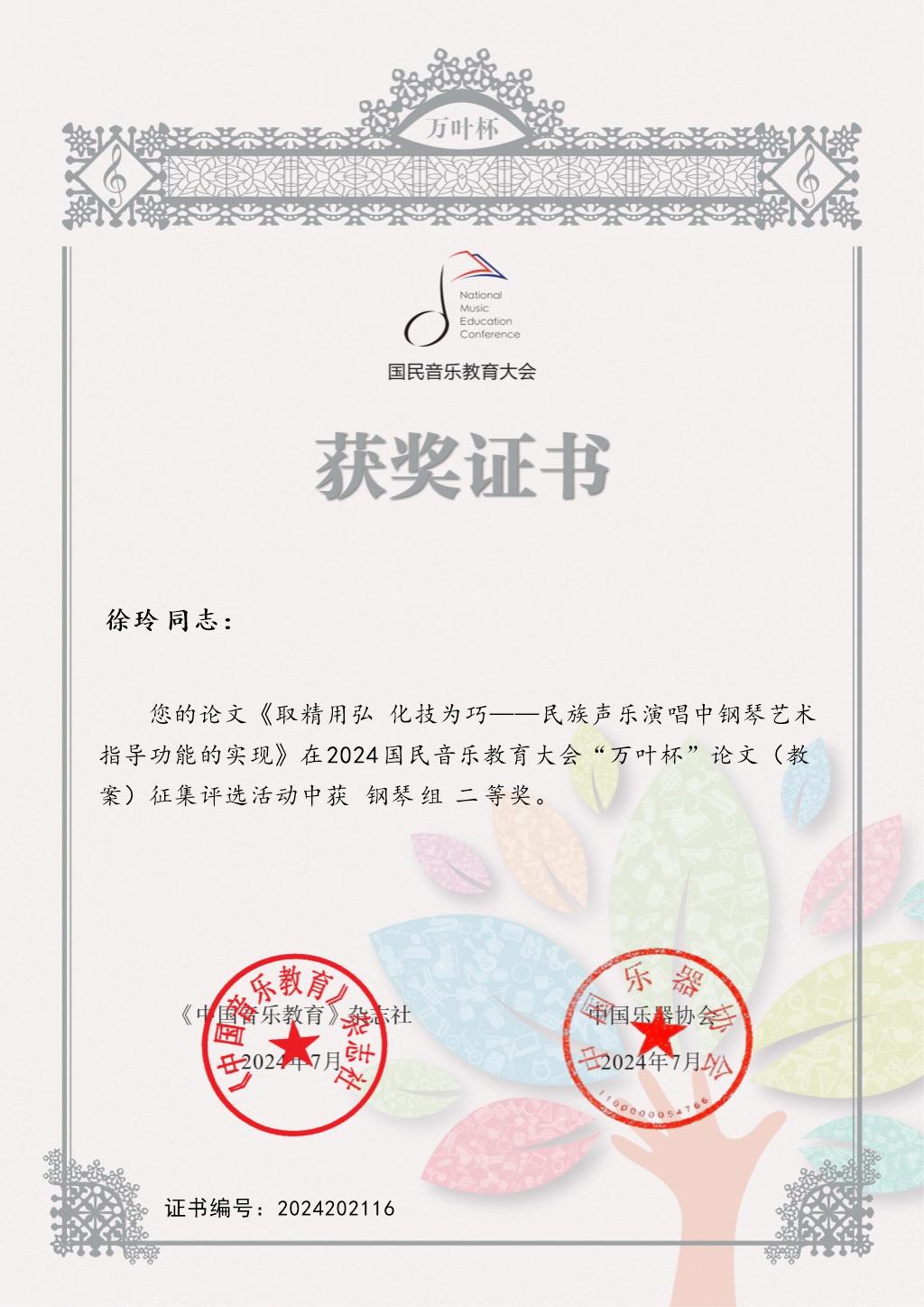 近日,歌劇學院教師徐玲撰寫的論文《取精用弘 化技為巧——民族聲樂演唱中鋼琴藝術指導功能的實現》在2024國民音樂教育大會“萬葉杯”論文(教案)征集全國評選活動中獲“鋼琴組”二等獎。